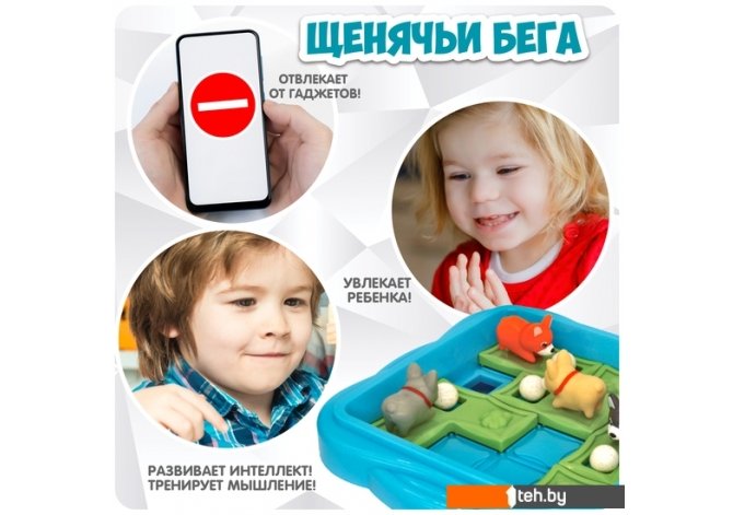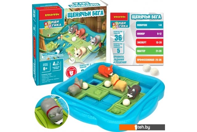 | Информация | Какие игры у щенков? Наши собачки играют в гольф. Помогите им закинуть все шарики в лунки. Настольная игра "ЩЕНЯЧЬИ БЕГА" от Bondibon имеет множество вариантов заданий с различными уровнями сложности. Решайте задания и развивайте логическое мышление, концентрацию внимания и мелкую моторику. Выберите задание и расположите детали на игровом поле указанным образом. Скользите плитками с щенками по горизонтали и вертикали так, чтобы все шарики упали в лунки. Самый короткий путь решения показан в конце буклета с заданиями. Всего 36 заданий и 5 уровня сложности. |