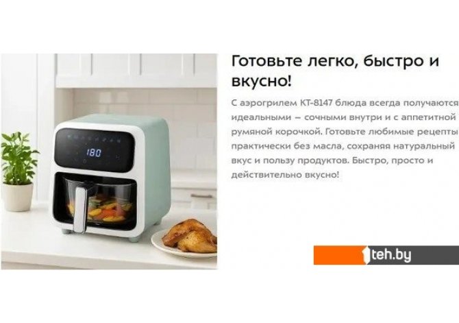 | Информация | -Ключевые характеристики Аэрогриль идеально подходит для тех, кто ценит быстрое и здоровое приготовление пищи, ведь его мощность составляет 1800 Вт, а объем рабочей чаши равен 4 л. Сенсорное управление обеспечивает точную настройку температуры в диапазоне 80 - 200°C и времени до 60 минут, что позволяет готовить разнообразные блюда с минимальным использованием масла. -Преимущества и отличия Модель выделяется наличием 8 автоматических программ, которые оптимально подбирают параметры для популярных блюд. Система циркуляции горячего воздуха обеспечивает равномерное прожаривание и сохранение сочности продуктов без риска пригорания и необходимости постоянного контроля. -Практичность Устройство легко обслуживать - съемная чаша и решетка быстро очищаются после использования. Для безопасной эксплуатации необходимо обеспечить свободное пространство сзади, что предотвращает повреждение мебели горячим воздухом. -Уникальность Современные технологии приготовления, реализованные в данной модели, позволяют автоматизировать процесс и получать стабильный результат. Сенсорное управление и широкий диапазон температур делают этот аэрогриль универсальным решением для домашних кулинарных экспериментов. Читать дальше |