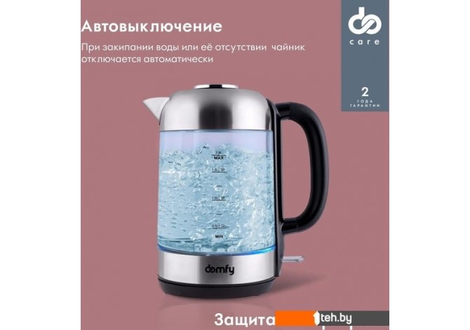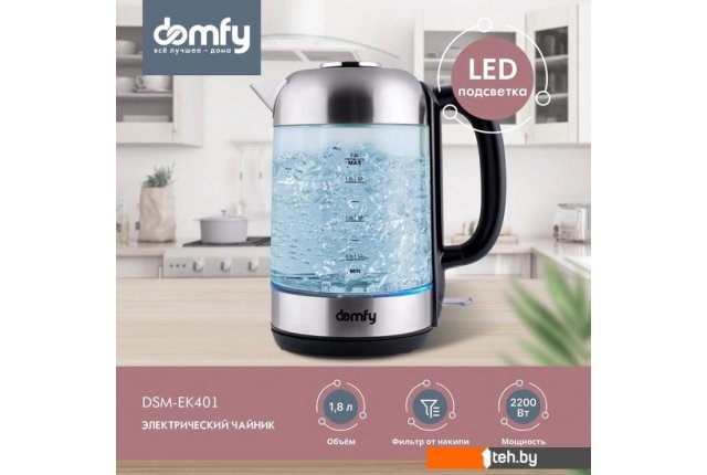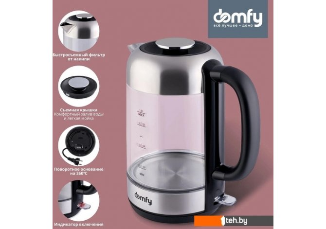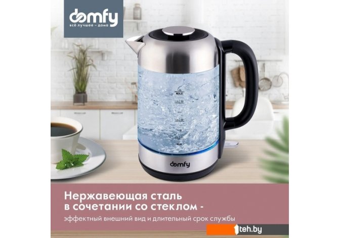 | Информация | Электрический чайник DOMFY DSM-EK401 объемом 1,8 л успешно совмещает в себе презентабельность и практичность. Корпус электрочайника изготовлен преимущественно из стекла и нержавеющей стали, что обеспечивает сочетание повышенной прочности и продолжительного ресурса. Характерной особенностью модели является полностью съемная крышка, облегчающая заливку воды. Контроллер Strix. Качественная контактная группа обеспечивает качественную работу до 10 000 включений. Корпус из стекла и металла. Контактирующие с водой элементы чайника выполнены из стекла и нержавеющей стали. Гармоничное сочетание материалов обеспечивает эффектный внешний вид и длительный срок службы. LED-подсветка. Светодиодная подсветка автоматически включается во время нагрева, придавая чайнику особую привлекательность. Съемная крышка. Полностью отделяемая от корпуса крышка существенно облегчает её наполнение из любой емкости или из-под крана. Защита от перегрева. Нагрев автоматически прекратится при отсутствии воды в чайнике, а также при достижении температуры 100 градусов Цельсия. Вращение на 360°. Кольцевые скользящие контакты обеспечивают возможность поворота электрочайника на основании и установки на него в любом положении. Мерная шкала. Метки с надписями на корпусе позволяют отмерить количество заливаемой воды с точностью до 250 мл. Фильтр от накипи. Интегрированный в носик чайника фильтрующий элемент задерживает посторонние частицы, которые могут образоваться в результате кипения жесткой воды. Комфортное включение и отключение. Электрочайник оснащен переключателем рычажного типа, плавно переходящим из одного положения в другое. Стеклянный электрочайник DOMFY DSM-EK401 надежен, удобен и прост в эксплуатации благодаря удобному управлению, съемной крышке и возможностью поворота на основании. Наличие подсветки и прозрачный корпус обеспечивают эффектный внешний вид при включении в темноте. |