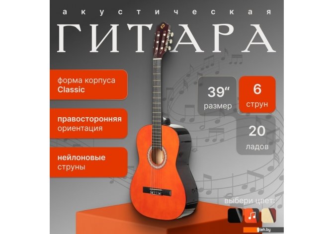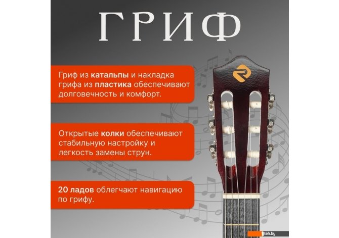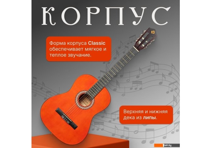 | Информация | - Акустическая гитара ROKSO FT-C-B39 - это инструмент, сочетающий классический дизайн и современные материалы, что делает его отличным выбором для музыкантов разного уровня. - Корпус гитары выполнен из легкой и прочной липы. Форма classic обеспечивает мягкое и теплое звучание, подходящее для различных жанров музыки. - Шесть нейлоновых синтетических струн обеспечивают мягкое и комфортное звучание, а гриф из катальпы в сочетании с пластиковой накладкой гарантирует долговечность и удобство при игре. На грифе расположено 20 ладов, что упрощает навигацию и расширяет возможности исполнения. - Открытые колки позволяют быстро и стабильно настраивать инструмент, а классическая конструкция без катавея делает гитару идеальной для освоения базовых техник и для регулярных занятий. |