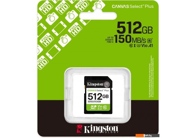Фотографии, описание и технические характеристики модели карты памяти Kingston Canvas Select Plus SDXC 512GB SDS3/512GB взяты из открытых источников, официального сайта производителя или представительства Kingston в Республике Беларусь.