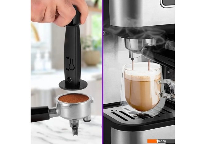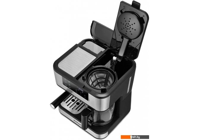 | Информация | Кофейная станция KT-7524 совмещает в себе два вида кофеварок: рожковую и капельную. Благодаря чему будет удобна, как и тем, кто пьёт все виды кофе и хочет сэкономить место на своей кухне, так и семьям с разными вкусовыми предпочтениями. Рожковая кофеварка поможет приготовить кофе эспрессо, капучино или латте, а также другие виды кофе на основе эспрессо. В рожковой кофеварке горячая вода под давлением проходит через молотый кофе и подается в чашку. Капельная кофеварка готовит крепкий, насыщенный фильтр-кофе. Вода в такой кофеварке доводится до температуры около 90°, после чего медленно поступает в фильтр с молотым кофе. Пройдя через него, она по каплям стекает в кофейник. С помощью стильной панели управления вы можете выбрать одинарный или двойной эспрессо, включить подачу пара на стимере, настроить температуру заваривания кофе. Молочную пенку для капучино можно делать самостоятельно. Капучинатор в кофеварке — это паровая трубка (стимер) с насадкой панаре?лло. Стимер погружают в холодное молоко, включают подачу пара и взбивают молочную пенку. Резервуар ёмкостью 1,6 л позволяет за один раз приготовить кофе на 10 больших порций кофе (по 150–160 мл). Корпус кофейника прозрачный, поэтому вы всегда можете видеть, сколько в нем кофе. KT-7524 будет удобна тем, кто пьёт все виды кофе, приготовленные в рожковой и капельной кофеварке. Кофе, приготовленный в рожковой кофеварке, обладает богатым вкусом, а кофе из капельной кофеварки обладает крепостью, которая взбодрит и придаст сил. |