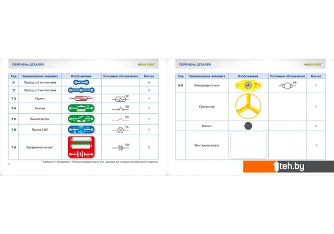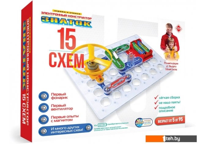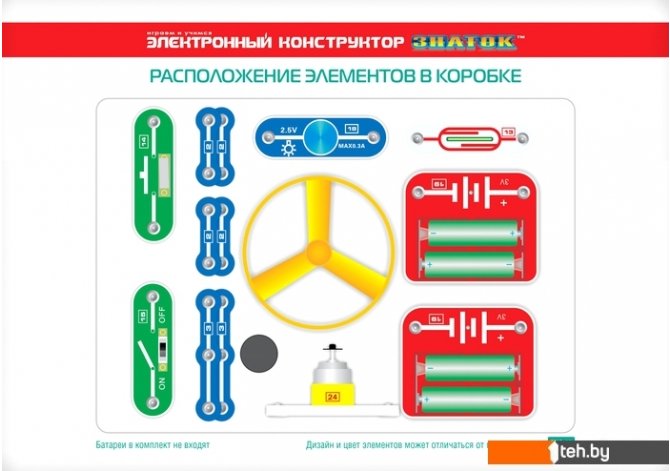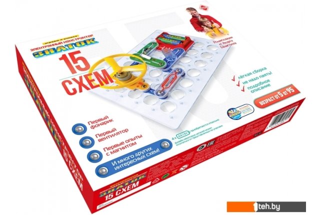 | Информация | Вам будет предложено собрать свой первый фонарик, первый вентилятор, провести первые эксперименты с магнитом – всего 15 разных проектов, наглядно показывающих принципы работы простейших электронных устройств. Для того чтобы ребёнок научился не просто собирать электрические схемы, а задумывался над собранным проектом, мы поместили комментарии с пояснениями и задания на быстрое усвоение важных знаний по физике. Мы рекомендуем данный набор для детей 6-12 лет, но фактически конструктор рассчитан практически на любой возраст, мы часто видим, как родители с удовольствием играют вместе с детьми. Простота соединений и ясность описания позволяет собирать сложные схемы даже ребенку пяти лет. 100% положительным результатом можно удивить родителей, друзей, учителей. Абсолютная безопасность и простота сборки – не надо паять! Помимо этого в «Руководстве пользователя» вы найдёте перечень элементов конструктора, а также их описание. Всего в набор входит 17 деталей, что позволяет, при определённом опыте, собрать больше проектов, чем описано в руководстве пользователя. Для удобства собирания деталей в коробку на последней обложке приведена схема расположения элементов. Отличный способ играть и учить физику! В комплектацию данного набора входит «Руководство пользователя» и детали, необходимые для выполнения предложенных в руководстве проектов. Руководство с описанием схем располагается в коробке под прозрачной монтажной платой. Нижняя часть коробки вместе с деталями и книгой запечатана в полиэтиленовую плёнку. Для работы схем необходимы 4 батареи (приобретаются отдельно) размера АА, напряжением 1,5 V, или аккумуляторы аналогичного размера, напряжением 1.2 V. |