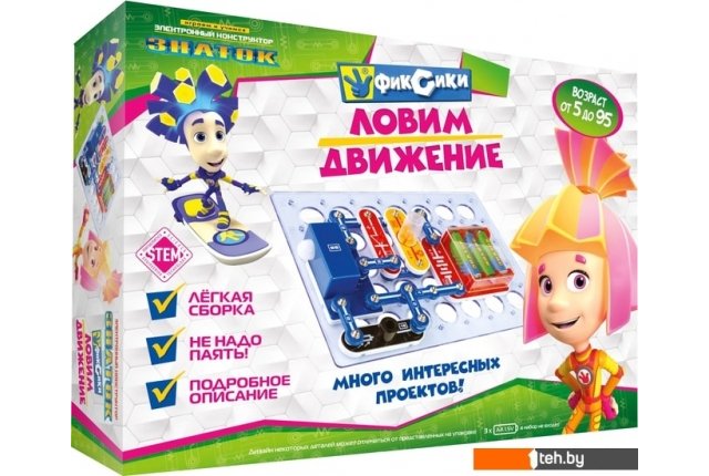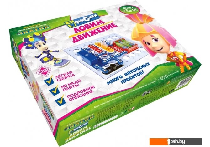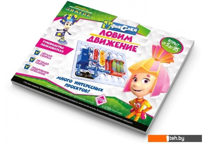 | Информация | Электронный конструктор начального уровня, позволяющий ребёнку понять, как работают многие «умные вещи» вокруг нас, и в частности, исследовать схемы с датчиком движения, который используется в реальной жизни для охраны помещений или автоматического включения оборудования. Даже без помощи взрослых, используя очень понятное цветное руководство, всего за несколько минут, дети смогут собрать и испытать схему с практически 100% положительным результатом. Очень полезна будет подсказка в виде QR-кода, которую можно просмотреть при помощи смартфона или планшета.Абсолютная безопасность и простота сборки — не надо паять!Мы рекомендуем данный конструктор для детей 5-10 лет, но он рассчитан практически на любой возраст. Простота соединений и ясность описания позволяет собирать сложные схемы даже ребенку пяти лет, но даже умудренному в электронике человеку будет интересно собрать и опробовать схему, а затем воплотить её в реальной жизни.Удовольствие получают не только дети, но и их родители!Помимо этого в «Руководстве пользователя» вы найдёте перечень элементов конструктора. Для удобства собирания деталей в коробку мы приводим схему расположения элементов.В комплектацию данного набора входит «Руководство пользователя» и детали, необходимые для выполнения предложенных в руководстве проектов. Руководство с описанием схем располагается в коробке под прозрачной монтажной платой. Нижняя часть коробки вместе с деталями и книгой запечатана в полиэтиленовую плёнку.Для работы схем необходимы 3 батареи (приобретаются отдельно) размера АА, напряжением 1,5 V.Обязательно посмотрите другие наборы «Фиксиков», каждый из них не повторяет, но дополняет другой! |