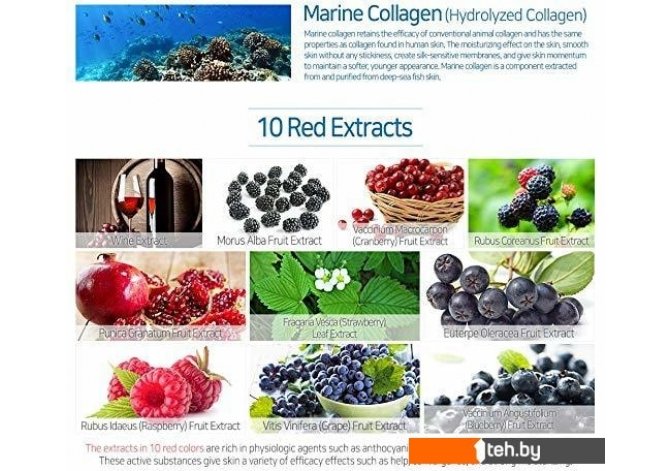 | Состав | Hydrolyzed Collagen (95%), Dipropylene Glycol, Glycereth-26, Ammonium Acryloyldimethyltaurate / VP Copoly mer, PEG-60 Hydrogenated Castor Oil, Water, Caprylyl Glycol, Allantoin, Dipotassium Glycyrhizate, Caprylhydroxamicic, Butry Disodium EDTA, Fragrance, Hyacinthus Orientalis (Hyacinth) Extract, Salvia Sclarea (Clary) Extract, Centaurea Cyanus Flower Extract, Borago Officinalis Extract, Chamomilla Recutita (Matricaria) Flower / Leaf Extract Lavandula Angustifolia (Lavender) Flower Water, Vitis Vinifera (Grape) Fruit Extract, Wine Extract, Vaccinium Macrocarpon (Cr anberry) Fruit Extract, Fragaria Vesca (Strawberry) Leaf Extract, Euterpe Oleracea Fruit Extract, Punica Granatum Fruit Extract Morus Alba Fruit Extract, Rubus Coreanus Fruit Extract, Vaccini umAngustifolium (Bluebery) Fruit Extract, Rubus ldaeus (Rasp berry) Fruit Extract, 1,2-Hexanediol, Cl 16185, Ethylhexylglycerin |
