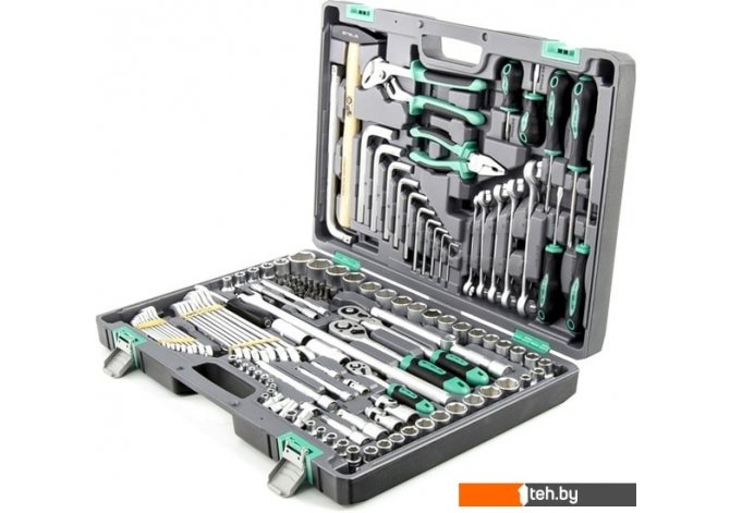 | Информация | Набор инструментов марки Stels состоит из 142 предметов, которые упакованы в специальном кейсе. Кейс сделан из сверхпрочного пластика. На все инструменты данного набора вам предоставляется гарантия в течении нескольких лет. Набор состоит их следующих инструментов: 3 трещоточные ключа, нескольких торцевых головок, более 10 гаечных ключей разного размера, 3 кардана, молотка, плоскогубцев и нескольких отверток. |