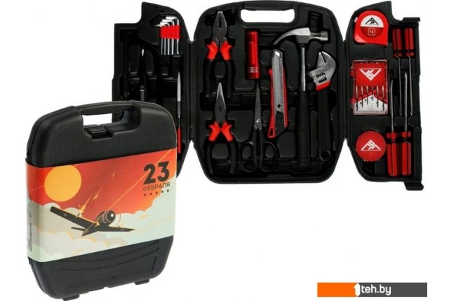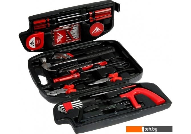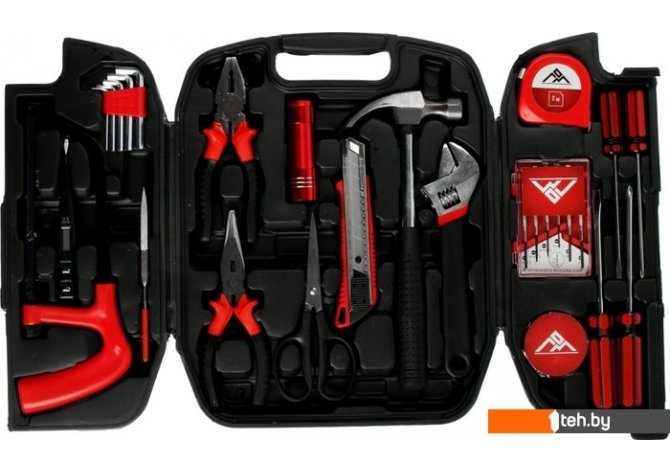 | Комплектация | Молоток-гвоздодер Пассатижи Длинногубцы Ключ разводной Нож универсальный Ножницы Фонарик Отвёртки 4 шт. Отвертки для точных работ 6 шт. Рулетка Ножовка по металлу Тестер напряжения Ключи шестигранные 5 шт. Надфиль Изолента |