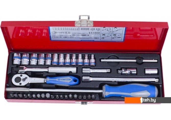 | Комплектация | - Трещотка 1/4", 140 мм, 24 зубца, флажковая, фиксатор KING TONY 2779-55G;- Отвертка вороток под вставки (биты) 1/4", 300 мм KING TONY 213312DF;- Вороток 1/4", 115 мм, скользящий KING TONY 2571-45;- Вороток 1/4", 125 мм, с шарниром KING TONY 2452-05F;- Держатель вставок (бит) 1/4">1/4" KING TONY 2141;- Кардан 1/4" KING TONY 2792;- Удлинитель 1/4", 50 мм KING TONY 2221-02;- Удлинитель 1/4", 150 мм KING TONY 2221-06;- Торцевые головки KING TONY серии 2335M, размеры: 4, 4.5, 5, 5.5, 6, 7, 8, 9, 10, 11, 12, 13 мм;- Вставки (биты) торцевые 1/4", HEX, KING TONY серии 1025H: 3, 4, 5, 6, 7, 8 мм;- Вставки (биты) торцевые 1/4", Phillips, KING TONY серии 1025P: №0, №1, №2, №3;- Вставки (биты) торцевые 1/4", Slotted, KING TONY серии 1025S: 4, 5.5, 7 мм;- Вставки (биты) торцевые 1/4", TORX, KING TONY серии 1025T: T10, T15, T20, T25, T30, T40. |
