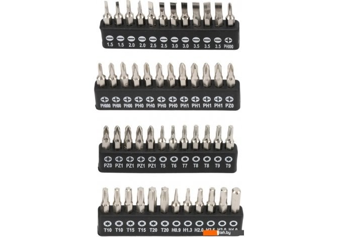 | Комплектация | ? Отвертка-держатель - 1 шт. ? Адаптер-удлинитель 150х4 мм - 1 шт. ? Биты 28х4 мм - 48 шт.: ? Биты HEX - H0.9, H1.3, H2.0, H2.5, H3.0, H4.0 ? Биты PH - PH000 (2 шт), PH00 (2 шт), PH0 (4 шт), PH1 (4 шт) ? Биты PZ - PZ0 (2 шт), PZ1 (4 шт) ? Биты SL - SL1.5 (2 шт), SL2.0 (2 шт), SL2.5 (2 шт), SL3.0 (2 шт), SL3.5 (3 шт) ? Биты TORX - Т5, Т6, Т7, Т8 (2 шт), Т9 (2 шт), T10 (2 шт), T15 (2 шт), T20 (2 шт) |