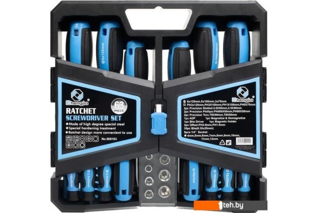 | Комплектация | отвертки стандартные:- шлиц: 3.0х75, 5.0х100, 6.0х125 мм- PH: PH0х75, PH1х100, PH2х100, PH2х125отвертки прецизионные:- шлиц: 2.0х50, 2.5х50 мм- PH: PH000х50, PH00х50- TORX: T6х50, T8х50отвертки изогнутые комбинированные:- PH1-5 мм, PH2-6 ммбиты - биты шлиц: 3.0, 4.0, 5.0, 5.0, 6.0, 6.0, 7.0, 7.0 мм- биты PH: PH0, PH1, PH1, PH2, PH2, PH3, PH3- биты PZ: PZ0, PZ1, PZ1, PZ2, PZ2, PZ3 PZ3- биты TORX: T10, T15, T20, T25, T27, T30- биты шестигранные: H3, H4, H5, H6- биты квадратные: S0, S1, S2, S3- адаптер для установки бит- магнитный удлинитель 60 мм- головки шестигранные 1/4”: 4, 5, 6, 7, 8, 9, 10, 11, 12 мм- отвертка для установки бит- намагничиватель/размагничиватель для бит |