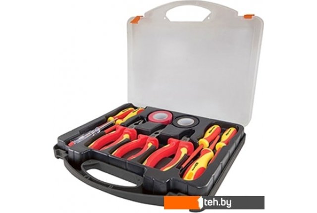 | Комплектация | - Две шлицевые отвертки: SL3x100 и SL5,5x125 мм- Три крестовые отвертки: PH0x60, PH1x80 и PH2x100 мм- Отвертка-индикатор- Пассатижи 160 мм- Бокорезы (кусачки) 160 мм- Длинногубцы 160 мм- Две изоленты ПВХ 0,13 мм х 18 мм х 9 м |