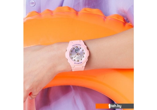 | Информация | Dive into summer fun with a playful, casual, active BABY-G in a color scheme that will send you soaking up the sun. The whimsical details and playful design in charming flamingo pink are sure to brighten your day. The color gradation on the dial recalls the changing summer beachscape as the sun sets. Index marks finished with metallic vapor deposition shine like pearl and seashell ocean treasures, while the minute hand evokes a mermaid tail. Bring the beach to your wardrobe and get your summer started. Playful, yet still practical. The shock-resistant structure stands up to bumps and scrapes, and water resistance up to 100 meters means you can even swim with it on. |