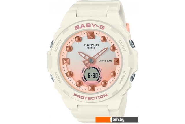 | Информация | Soak in the sparkle and shine of the summer sun with a beach-inspired monochromatic BABY-G. The BGA-320, with its slim, oh-so-wearable case, features raised metallic index marks in a vapor deposition finish that shine like pearls and seashells — treasures of the ocean. With a minute hand designed to evoke the tail of a mermaid, slip it on your wrist and the playful look is sure to brighten your day. These watches deliver practical functionality, as well. Shock-resistant construction and water resistance up to 100 meters frees you from worry about bumps and scrapes, even when swimming. |