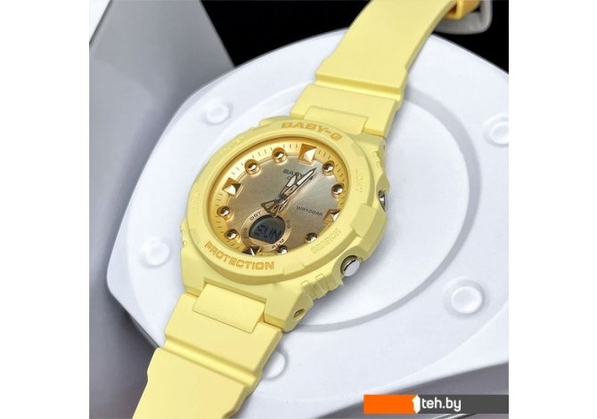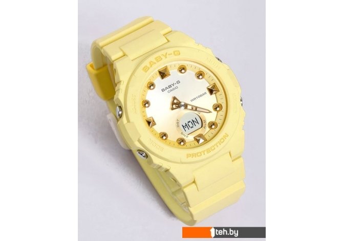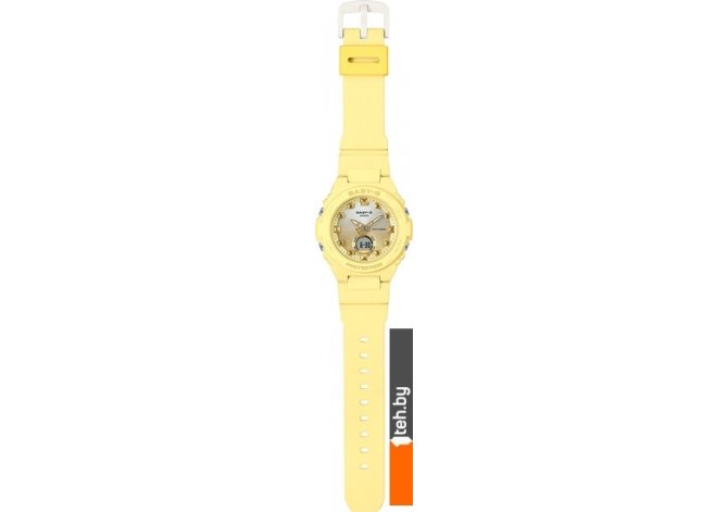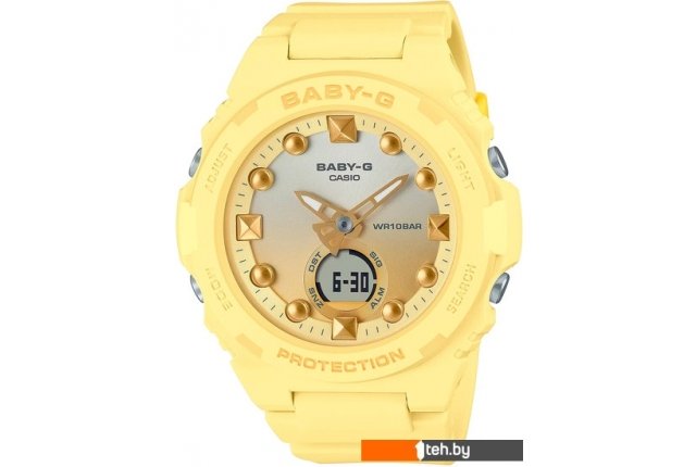 | Информация | Dive into summer fun with a playful, casual, active BABY-G in a color scheme that will send you soaking up the sun. The whimsical details and playful design in sunlight yellow are sure to brighten your day. The color gradation on the dial recalls the changing summer beachscape as the sun sets. Index marks finished with metallic vapor deposition shine like pearl and seashell ocean treasures, while the minute hand evokes a mermaid tail. Bring the beach to your wardrobe and get your summer started. Playful, yet still practical. The shock-resistant structure stands up to bumps and scrapes, and water resistance up to 100 meters means you can even swim with it on. |