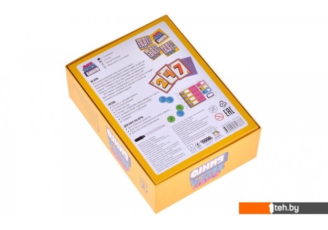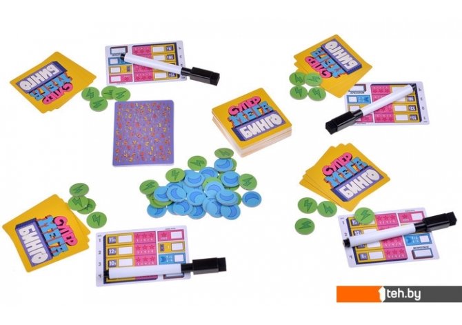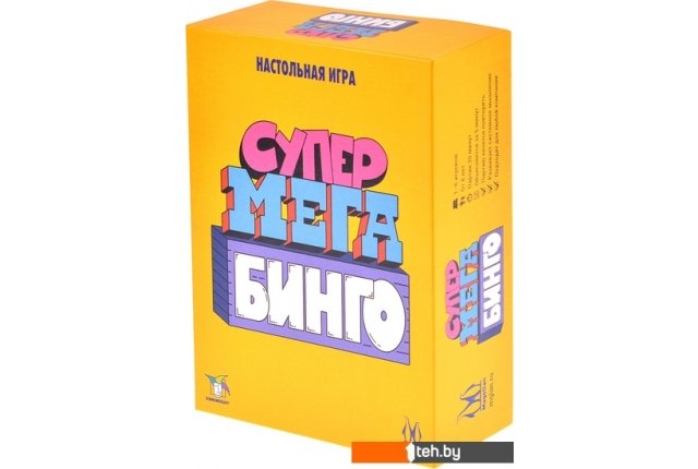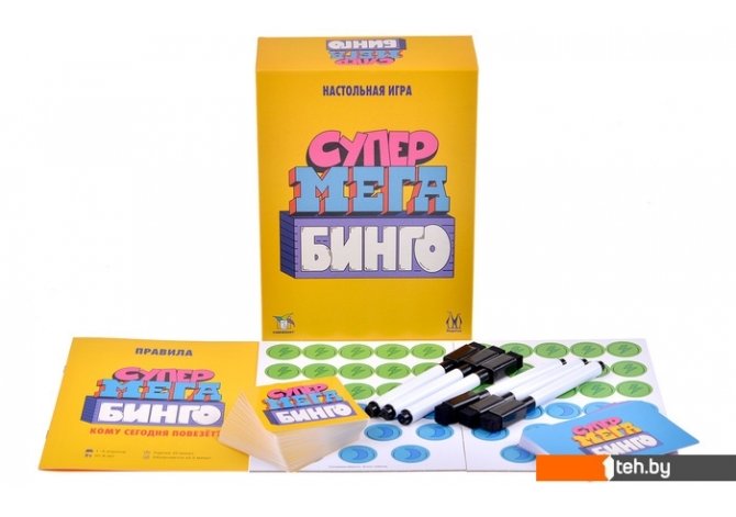 | Комплектация | — 60 карт с супермегабинго. — 30 жетонов молнии?. — 24 жетона лун. — 18 карт с номерами (два набора от 1 до 9). — 6 супермегакарт подсче?та очков. — 6 маркеров со стирашкои?. — Правила. |