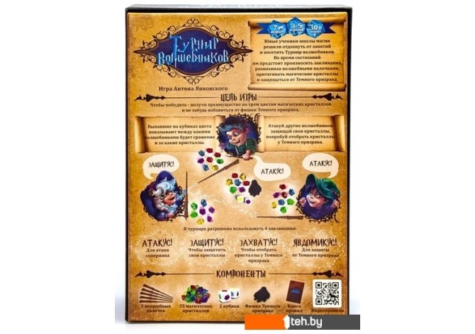 | Информация | Турнир волшебников - это быстрая и веселая игра с заклинаниями, в которой игроки берут на себя роли юных волшебников. Участники размахивают магическими палочками и произносят заклинания, чтобы заполучить кристаллы и защититься от Тёмного Властелина. Различные комбинации кубиков и кристаллов перед игроками заставляют разыгрывать определенные заклинания (Атакус, Защитус, Захватус и Явдомикус), и тот, кто первый сделает это правильно получает шанс забрать кристаллы противника или защититься от Темного Властелина. Быстро считайте кристаллы, произносите правильные заклинания и не позволяйте другим волшебникам опередить вас!Особенности игры:Атакуй других волшебников, защищай свои кристаллы, попробуй отобрать кристаллы у Темного призрака.Выпавшие на кубиках цвета показывают между какими волшебниками будет сражение и за какие кристаллы.В турнире разрешено использовать 4 заклинания. |