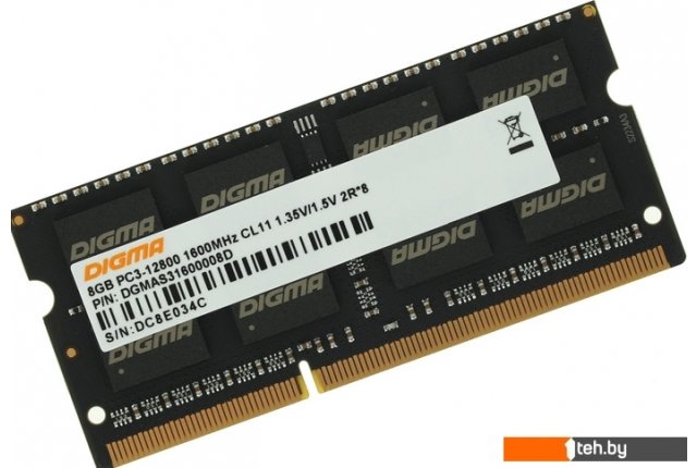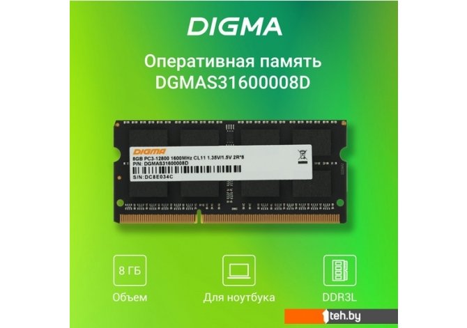 Фотографии, описание и технические характеристики модели оперативной памяти Digma 8ГБ DDR3 SODIMM 1600 МГц DGMAS31600008D взяты из открытых источников, официального сайта производителя или представительства Digma в Республике Беларусь.
