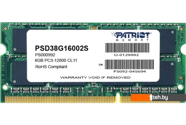 Фотографии, описание и технические характеристики модели оперативной памяти Patriot Signature 8GB DDR3 SO-DIMM PC3-12800 (PSD38G16002S) взяты из открытых источников, официального сайта производителя или представительства Patriot в Республике Беларусь.