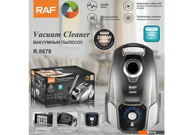 Фотографии, описание и технические характеристики модели пылесоса Raf R.8679 взяты из открытых источников, официального сайта производителя или представительства Raf в Республике Беларусь.