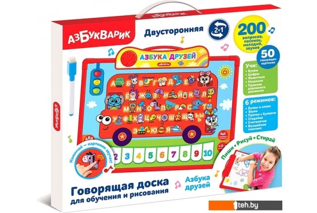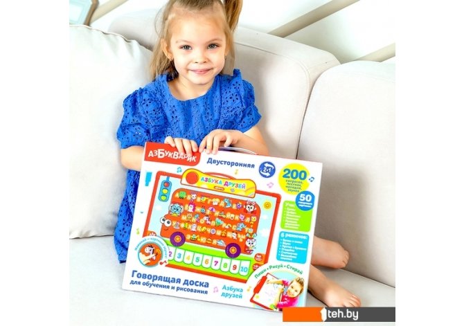 | Информация | Интерактивная двусторонняя говорящая доска – для веселого современного обучения! Первая сторона – «Нажимай и учись». Все картинки – говорящие! Нажимай – слушай и учи буквы и цифры, знакомься с животными, машинками, правилами дорожного движения. Чтобы учиться было интереснее, послушай обучающие песенки, веселые мелодии со звуками машинок и 5 детских хитов («Фантики», «Зверюшки», «Догони», «Барбарики», «Как чудесно жить на свете»). Если ты уже все выучил, проверить знания помогут умные игры: «Прятки с буквами», «Угадайка» и «Считалочка». А в игре «Волшебное пианино» ты сможешь сам сыграть 10 популярных мелодий, как настоящий музыкант! Вторая сторона – «Пиши, рисуй, стирай». Здесь есть где разгуляться детской фантазии! Рисуй любыми цветными фломастерами, пиши цифры и буквы, а потом стирай и рисуй снова (в комплект входит фломастер со специальным ластиком в колпачке). |