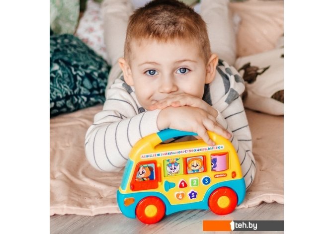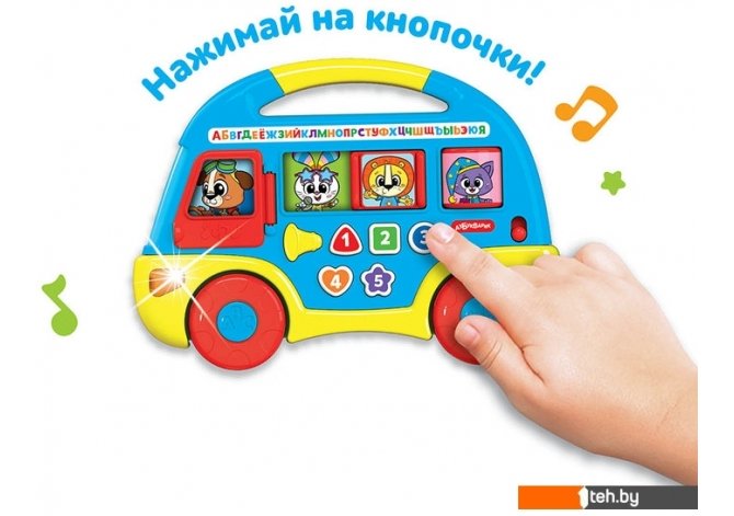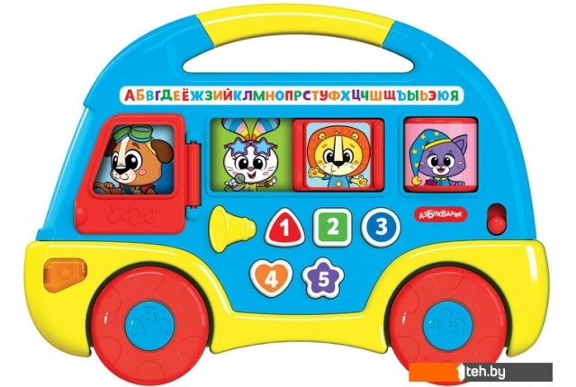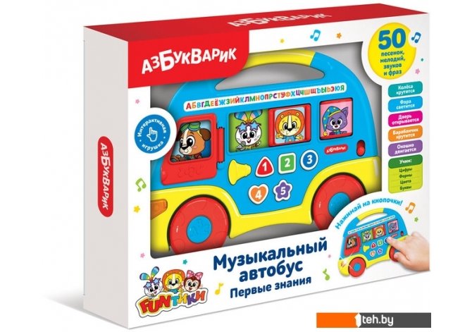 | Информация | ? В большом музыкальном автобусе Азбукварик Музыкальный автобус. Первые знания / 2808 (синий) веселые песенки и первые знания! Выберите один из двух режимов — обучающий или музыкальный. Нажимая на фигурные кнопочки, ребенок будет учить цифры, формы и цвета, послушает обучающие песенки, детские хиты, танцевальные мелодии и веселые звуки. Автобус можно катать — колесики у него крутятся, а еще у него открывается дверь, двигается окошко, крутится окошко-барабанчик и светится фара! Пассажиры веселого автобуса — это новые герои Фантики. Это дружная компания из шести зверят: Львенок Лева, Заюшка Зайка, Щенок Тима, Слоник Слоняша, Обезьянка Ириска и Котенок Сплюшик. Отправляйтесь в путешествие вместе с Фантиками! ??Батарейки в комплект не входят. |