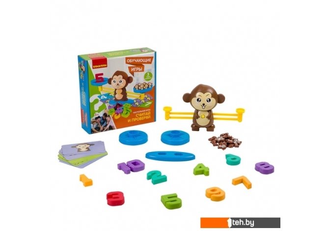 | Комплектация | двусторонняя карта-задание - 30 шт., обезьянка - 19 шт., объемная цифра - 10 шт., чаша весов - 2 шт., основа весов - 1 шт., корпус весов. |