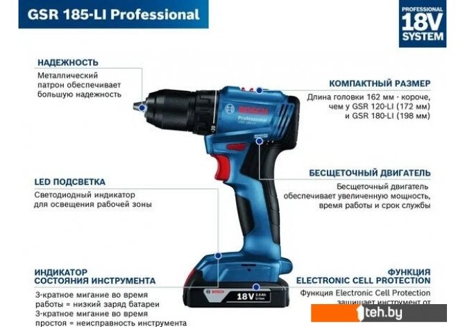 Фотографии, описание и технические характеристики модели Bosch GSR 185-LI Professional 06019K3080 (с 2-мя АКБ, кейс) взяты из открытых источников, официального сайта производителя или представительства Bosch в Республике Беларусь.