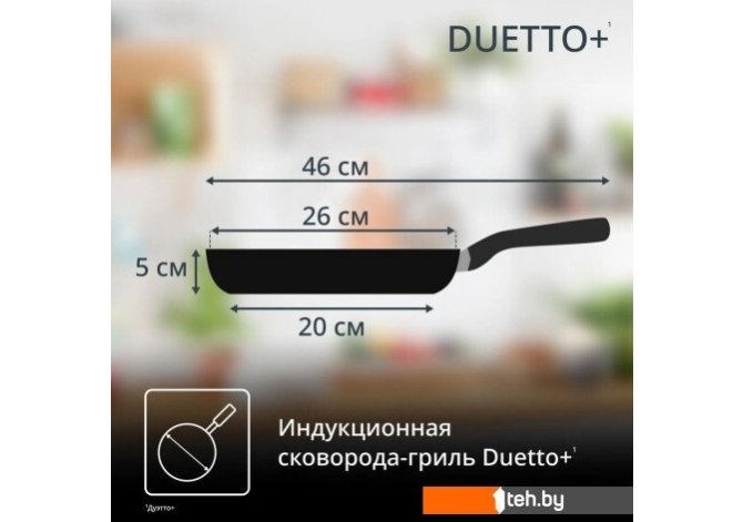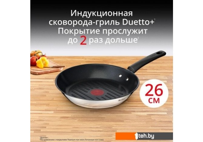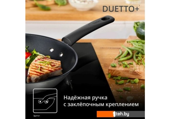 Фотографии, описание и технические характеристики модели сковородоки Tefal Duetto+ G7334055 взяты из открытых источников, официального сайта производителя или представительства Tefal в Республике Беларусь.