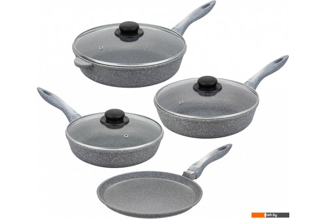 | Состав набора | 3 глубоких сковороды, 3 крышки, блинная сковорода |