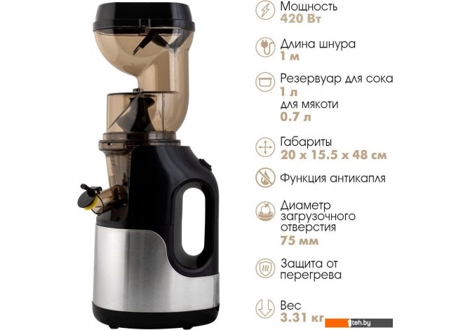 | Информация | ??Текст описания составлен при помощи искусственного интеллекта. - Соковыжималка Endever Sigma-103 — это идеальный помощник для любителей свежевыжатых соков! С её помощью вы сможете легко и быстро приготовить натуральные напитки из фруктов и овощей, сохраняя все полезные вещества. - Благодаря шнековой конструкции, эта соковыжималка обеспечивает максимальную эффективность отжима и минимальное количество отходов. Вы сможете наслаждаться вкусом свежего сока без лишней мякоти! - С мощностью 420 Вт и функцией реверса, Endever Sigma-103 справится даже с самыми твердыми ингредиентами. Блокировка устройства гарантирует безопасность во время работы, что особенно важно при использовании. - Удобный загрузочный лоток с диаметром 75 мм позволяет помещать целые фрукты и овощи, что значительно экономит ваше время. В комплекте вы найдете все необходимое: от чаши до чистящей щетки, что делает процесс приготовления сока еще более комфортным. - Обратите внимание на компактные размеры соковыжималки: высота 48 см, ширина 20 см и глубина 15.5 см, что позволяет легко разместить её на кухне, даже если у вас ограниченное пространство. - С ёмкостью для сока 1 литр и резервуаром для мякоти 0.7 литра, вы сможете готовить достаточно сока для всей семьи. Наслаждайтесь здоровыми напитками каждый день с Endever Sigma-103! |