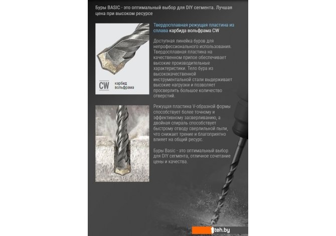 | Информация | - Сверло-бур по бетону Basic SDS+ 692241 подходит для перфораторов с системой крепления SDS-Plus. - Идеально подходит для бурения отверстий в бетоне, камне, кирпиче. - Твердосплавная пластина на качественном припое обеспечивает высокую производительность. - Двойная спираль обеспечивает быстрый отвод сверлильной пыли, снижая трение. - Тело бура из высококачественной инструментальной стали выдерживает высокие нагрузки. - Режущая пластина V-образной формы обеспечивает более точное и эффективное засверливание. |