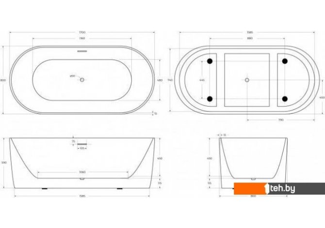 | Информация | Отдельностоящая овальная ванна из литьевого акрила в комплекте со сливом-переливом цвета хром. |